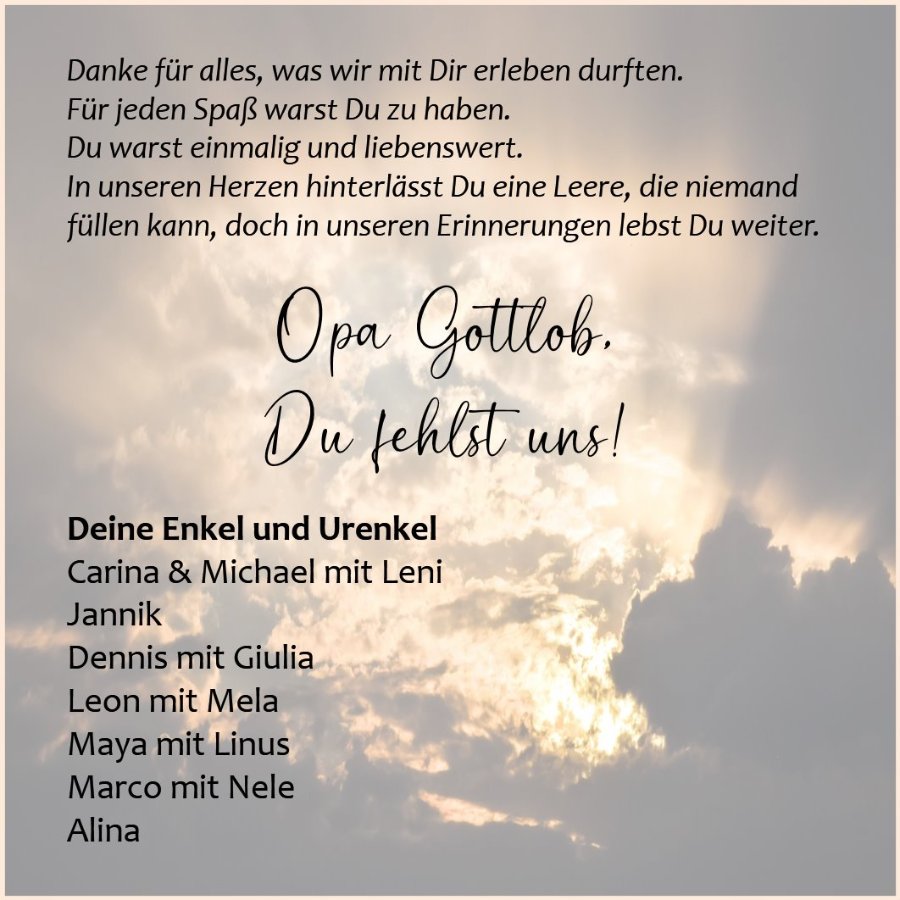 wir wünschen Ihnen von Herzen viel Kraft, dass Sie Menschen um sich haben, die Ihnen in dieser schweren Zeit beistehen und Halt geben. Zusätzlich können Sie auf dieser Gedenkseite Erinnerungen teilen und so das Andenken gemeinsam wachhalten.